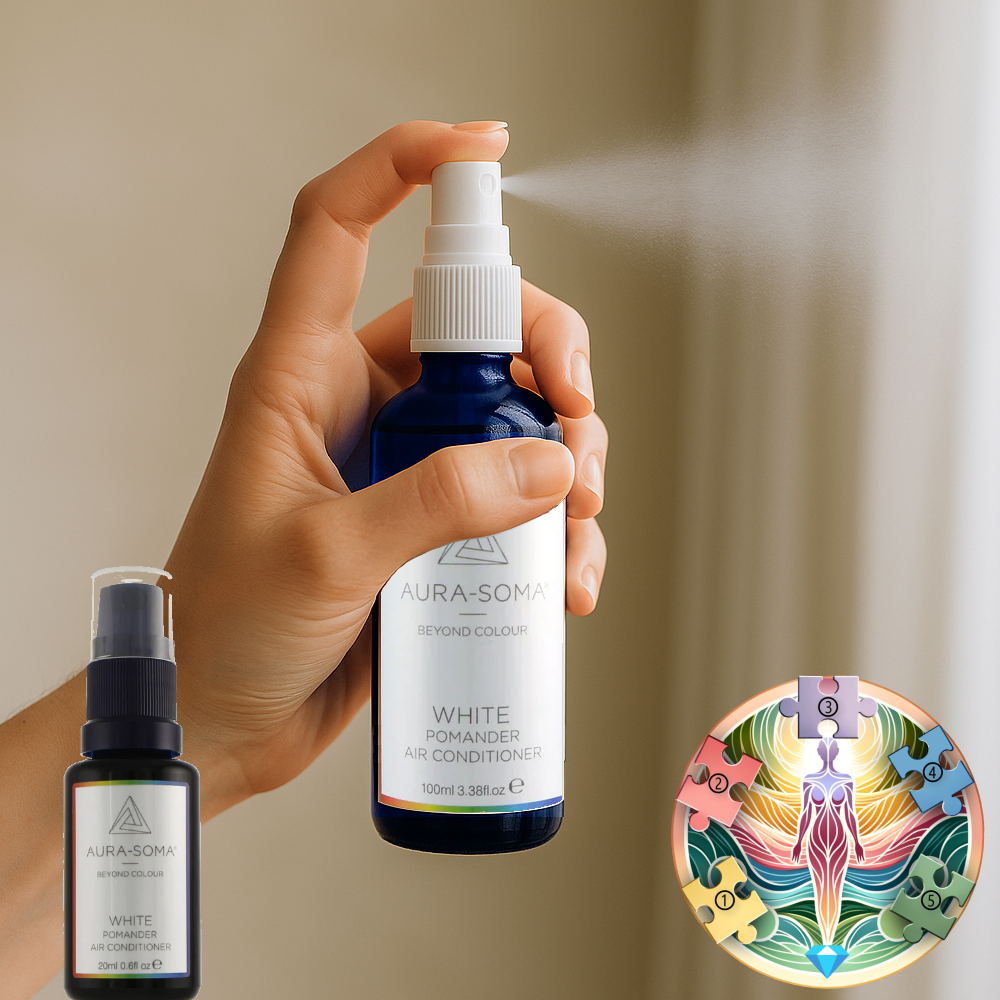 Řeč je o Prostorovém pomanderu „White“ BÍLÁ – prostorovém vibračním spreji od Aura-Soma®, který se stal každodenní součástí mé práce i mého osobního života. Je to přírodní esence, která čistí, chrání, projasňuje a ladí. Nejen prostor fyzický, ale i vnitřní krajinu našich myšlenek.